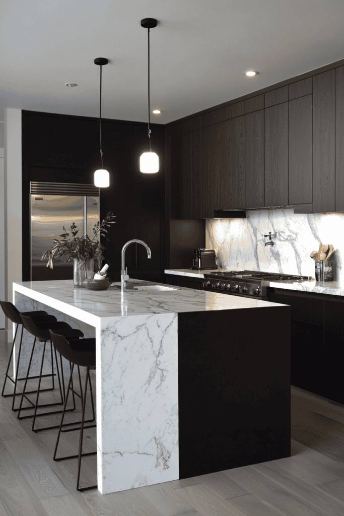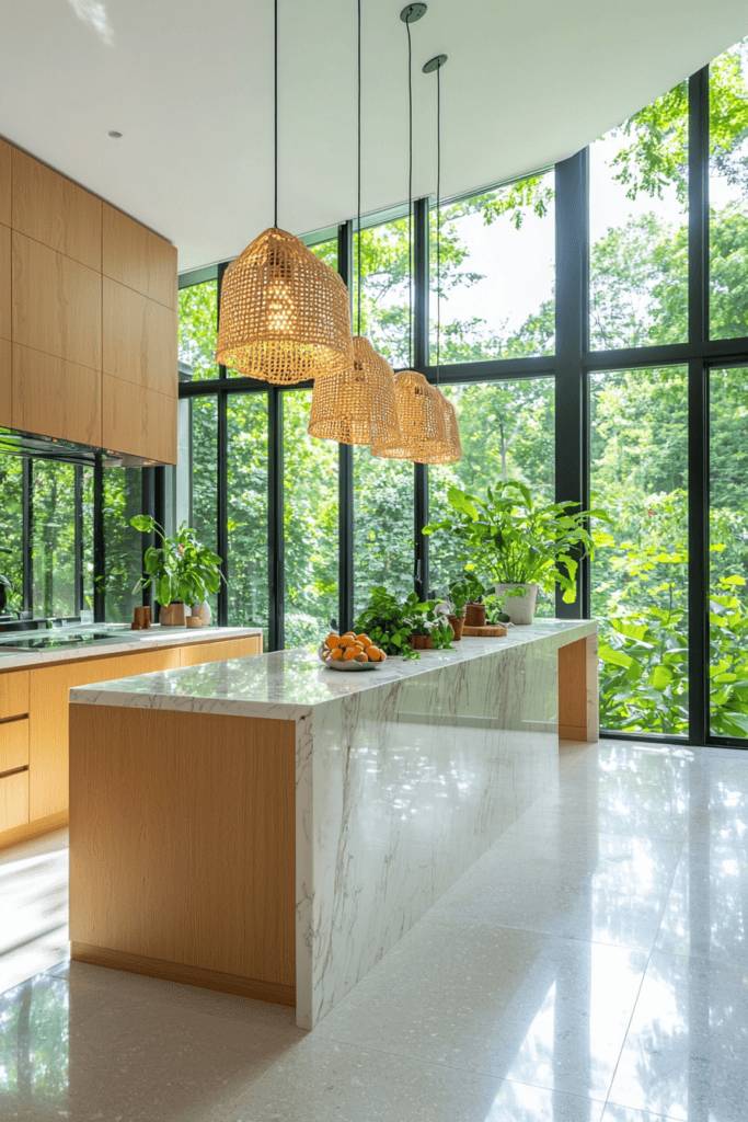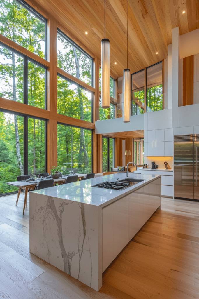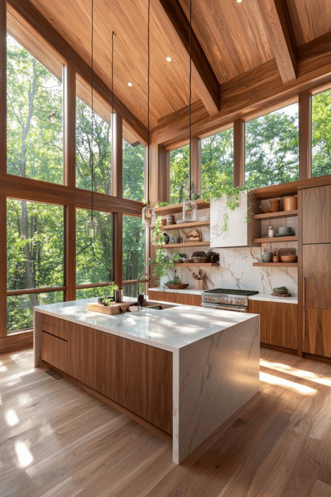 Consider a spacious island with bar seating, inviting guests to gather while you cook. To enhance ambiance, install ambient lighting and surround your kitchen with lush greenery for a rejuvenating vibe.
