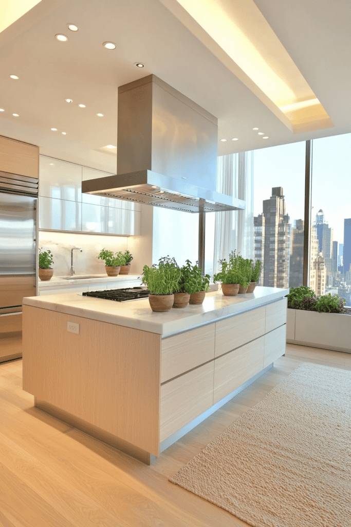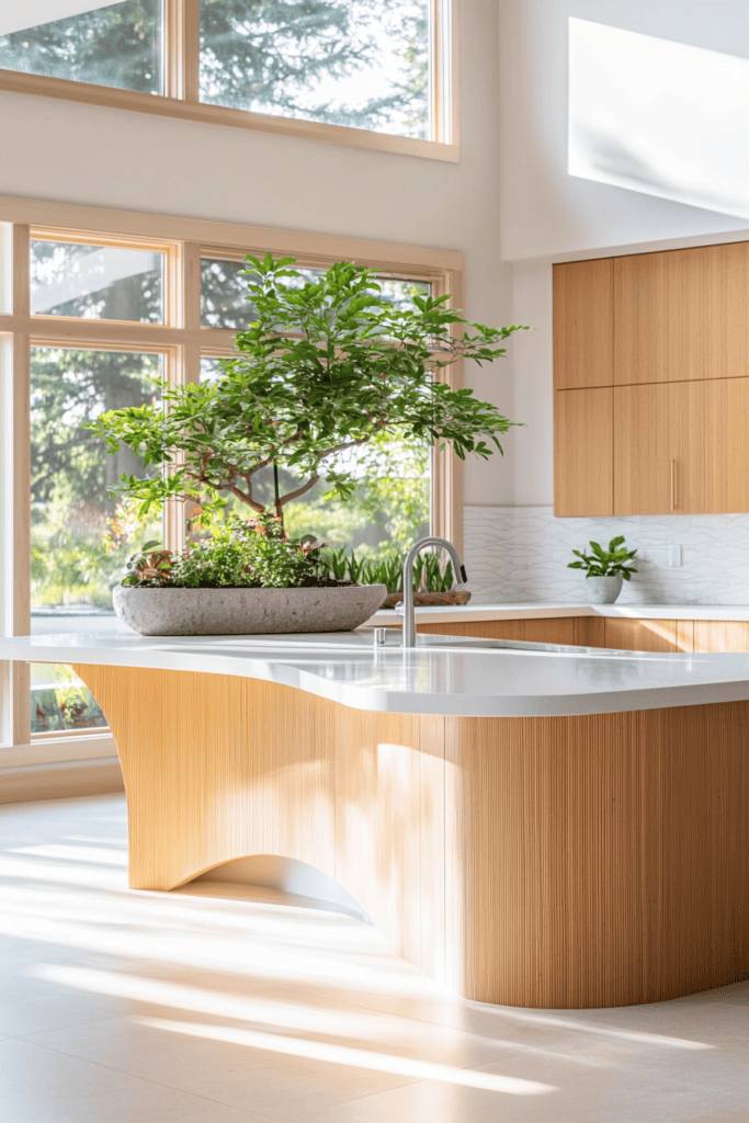 Creating a serene zen space in your kitchen can transform cooking into a mindful experience. Imagine soft, natural lighting filtering through sheer curtains, casting gentle shadows across a minimalist design. Use calming colors like soft greens or warm neutrals to create an inviting atmosphere. Incorporate natural materials like bamboo or stone for countertops and cabinetry, enhancing the peaceful vibe.