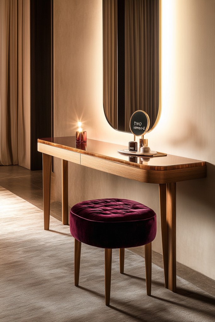 9. Console-Style Vanity with Velvet Stool