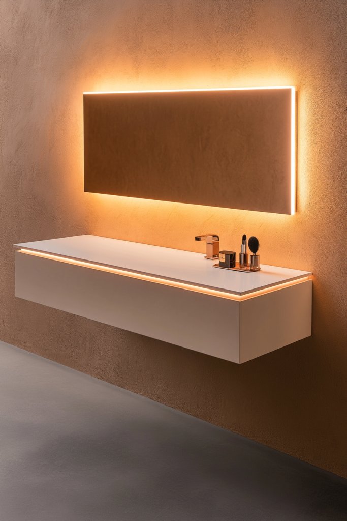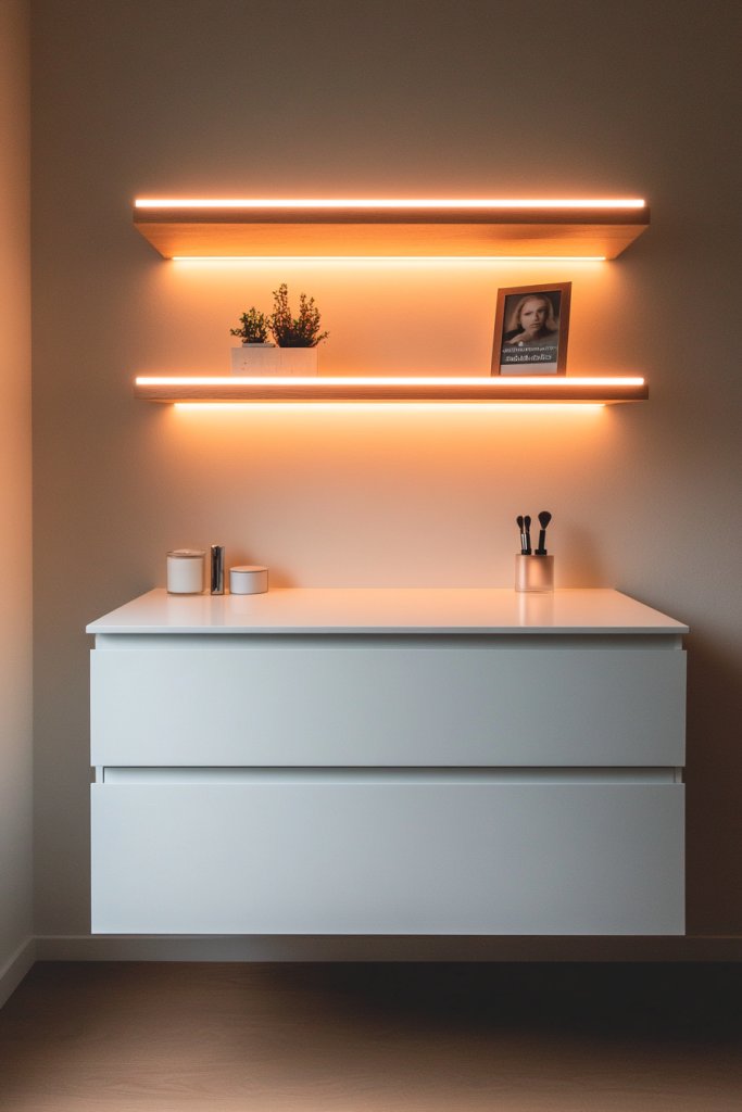 Picture a sleek, wall-mounted surface with clean lines, seemingly floating mid-air. Soft LED strips run along the edges, casting a gentle glow that highlights the contours and creates a warm ambiance. The surface is smooth, maybe in matte black or crisp white, with a simple mirror above and minimal accessories on top. The overall effect is futuristic, elegant, and uncluttered, perfect for a contemporary glam bedroom.