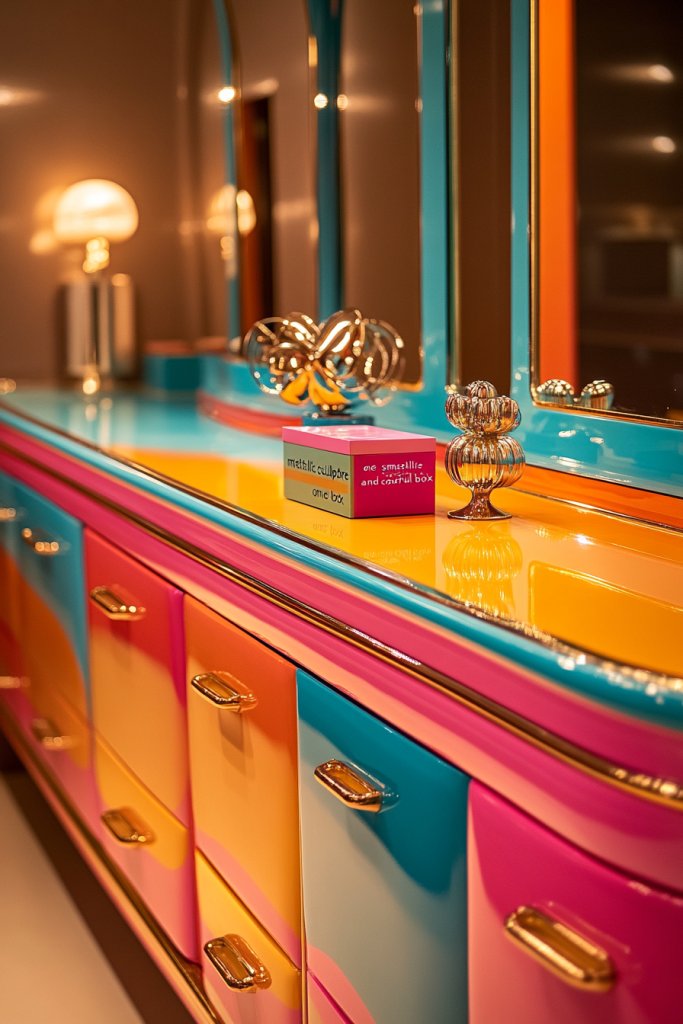 Choose a sturdy, colorful piece and add metallic hardware—handles, knobs, or decorative legs—that sparkle. Incorporate a vintage mirror with a decorative frame or a modern geometric shape. Use bright textiles or patterned cushions to soften the overall look. Keep the surface clear, and add accent lighting to highlight the metallic details. Regular dusting and polishing maintain the glam flair.