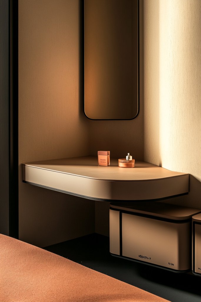 Imagine a small, corner-mounted vanity with a curved or angular design that fits perfectly into a corner. It features a mirror, a few drawers or shelves, and a plush stool. The finish could be light wood, glossy white, or matte black, depending on your decor. The space feels intentional, cozy, and efficient—an oasis of beauty in a tiny footprint.