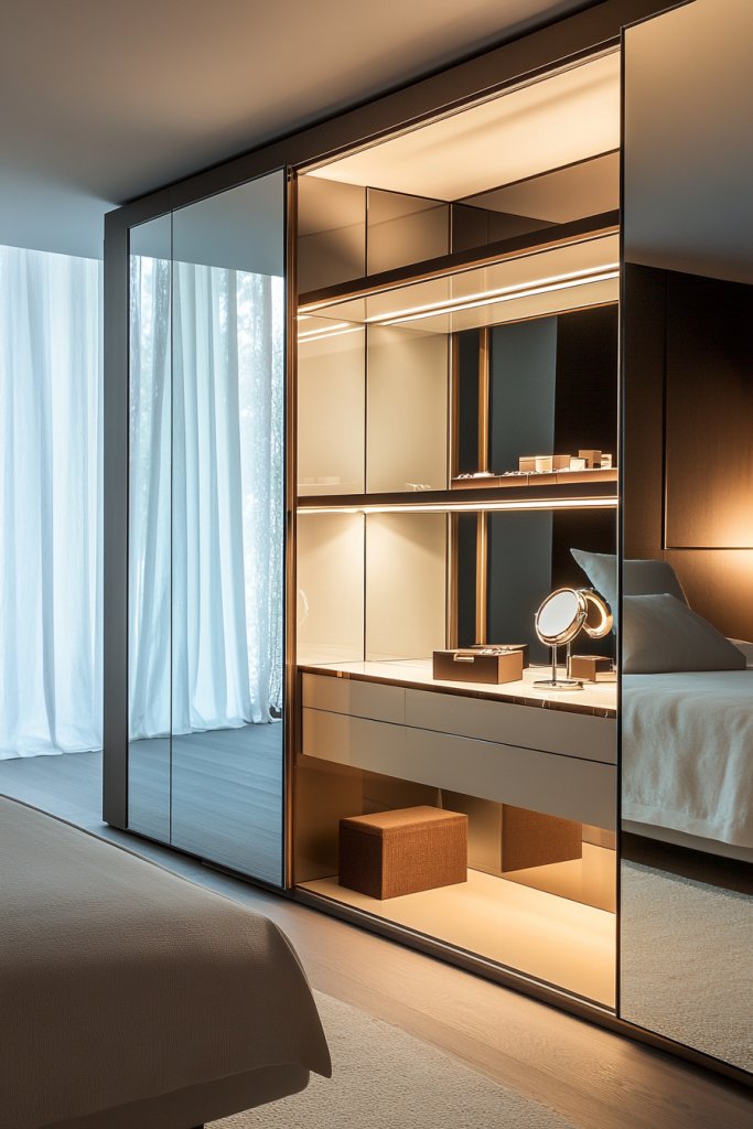 Visualize sleek sliding doors with full-length mirrors, hiding a dedicated vanity niche inside. When open, a well-organized space reveals a mirror, a small surface for makeup, and storage compartments. The sliding doors reflect your style, making the room appear larger and more cohesive. The overall look is clean, modern, and highly functional.