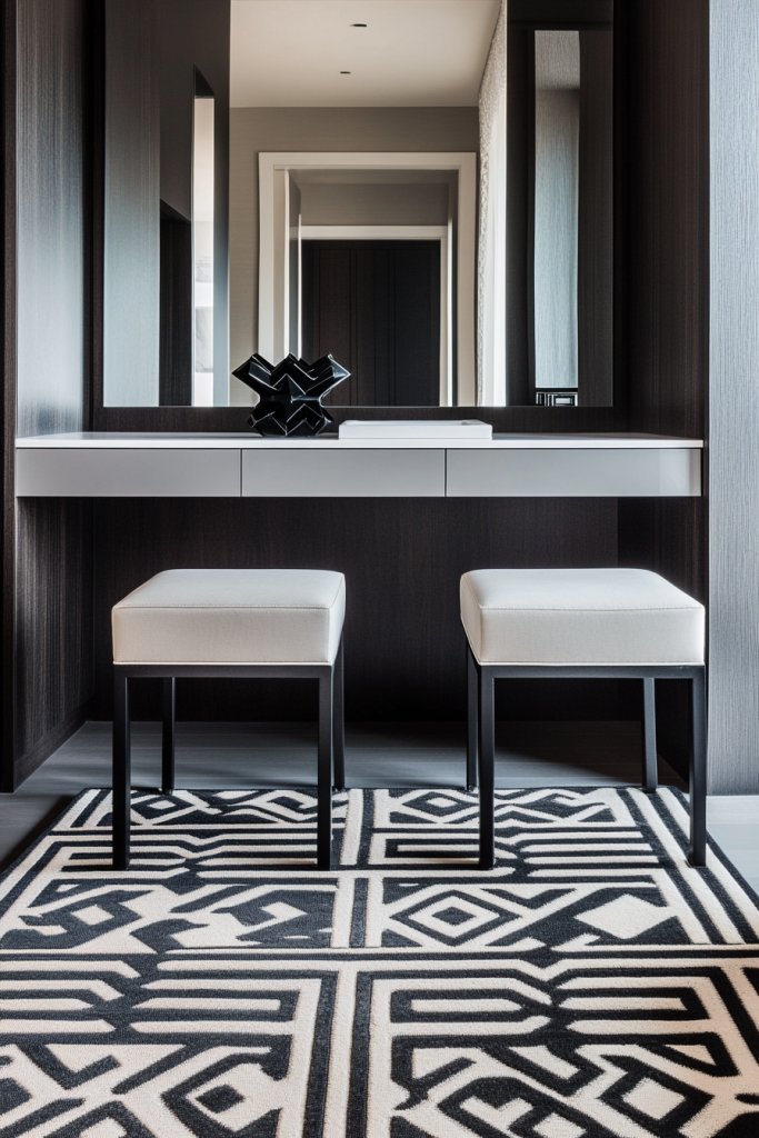 Picture a sleek, black vanity against crisp white walls, paired with a bold, geometric rug that anchors the space. The furniture is minimalist, with clean lines and subtle hardware. The contrast draws the eye, while the rug adds pattern and texture, making the whole setup feel dynamic and polished. It’s a classic combo that never goes out of style.