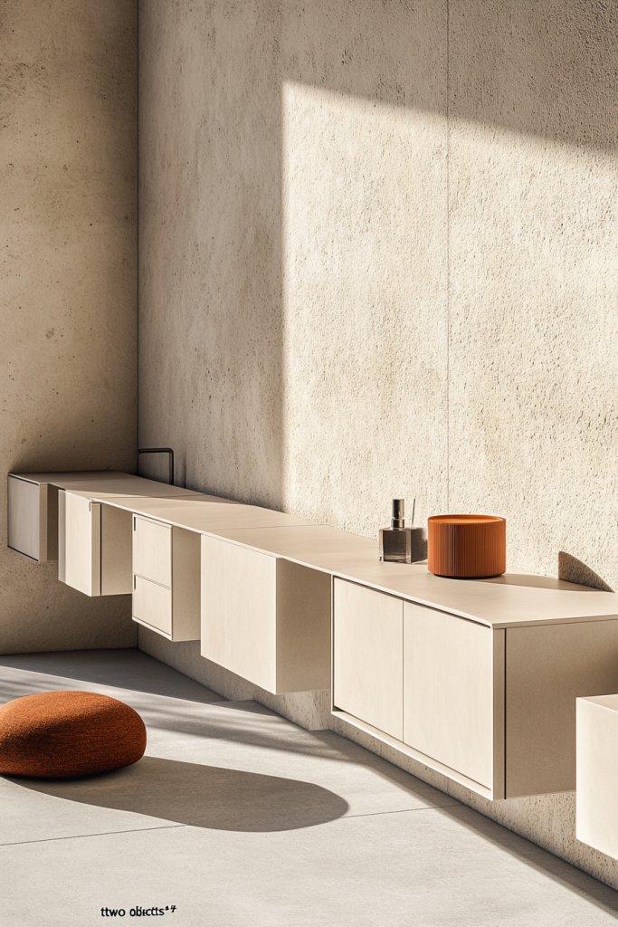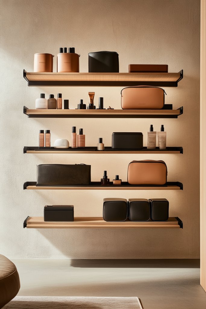 Imagine sleek, floating shelves mounted on the wall, with clear or decorative containers neatly arranged. The open design allows you to see your essentials at a glance, while stylish organizers keep everything tidy. Add a mirror above and a chic stool or chair nearby. The overall look is modern, functional, and inviting, turning your routine into a display of your personality.
