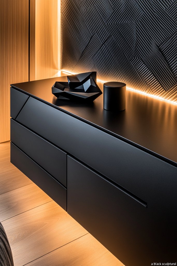 Picture a sleek vanity in matte charcoal or deep black, with textured surfaces—ribbed, patterned, or embossed—that add tactile depth. Metallic accents like brushed brass or chrome hardware highlight the design, catching the light beautifully. Pair it with a textured cushion or a plush rug to enhance the tactile experience and elevate the overall vibe. The space feels both modern and opulent.