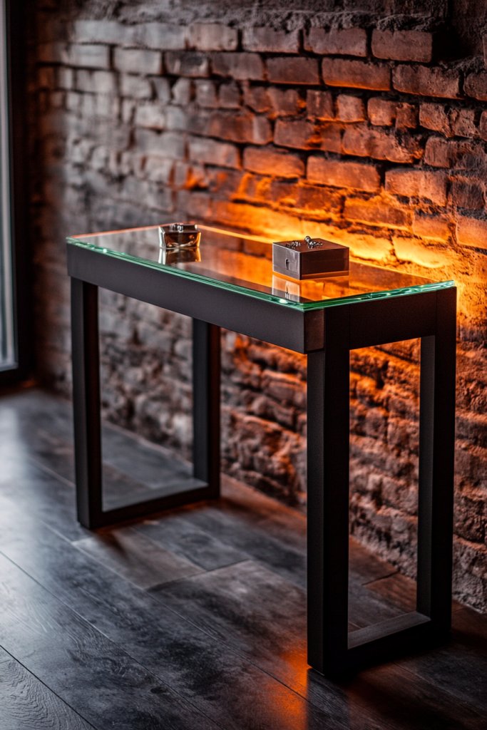 Picture a clear tempered glass surface supported by black or brushed metal legs and framing. The transparency allows your flooring or rug underneath to show through, adding depth. Minimalist storage underneath or to the sides keeps essentials within reach without cluttering the look. The overall vibe is industrial, sleek, and effortlessly sophisticated, ideal for a contemporary space.