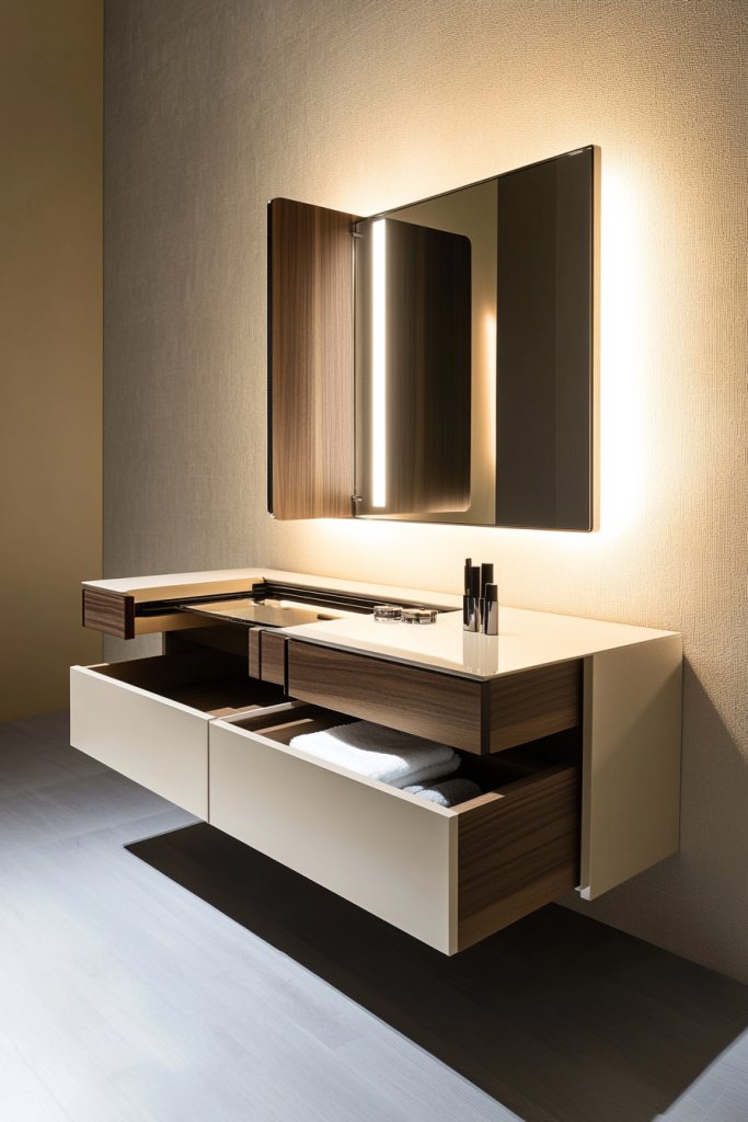 A multi-functional vanity with hidden storage proves that style doesn’t have to be sacrificed for practicality. It helps you start your day smoothly and keeps your space looking tidy. Embrace this clever design to boost confidence and enjoy a clutter-free routine.