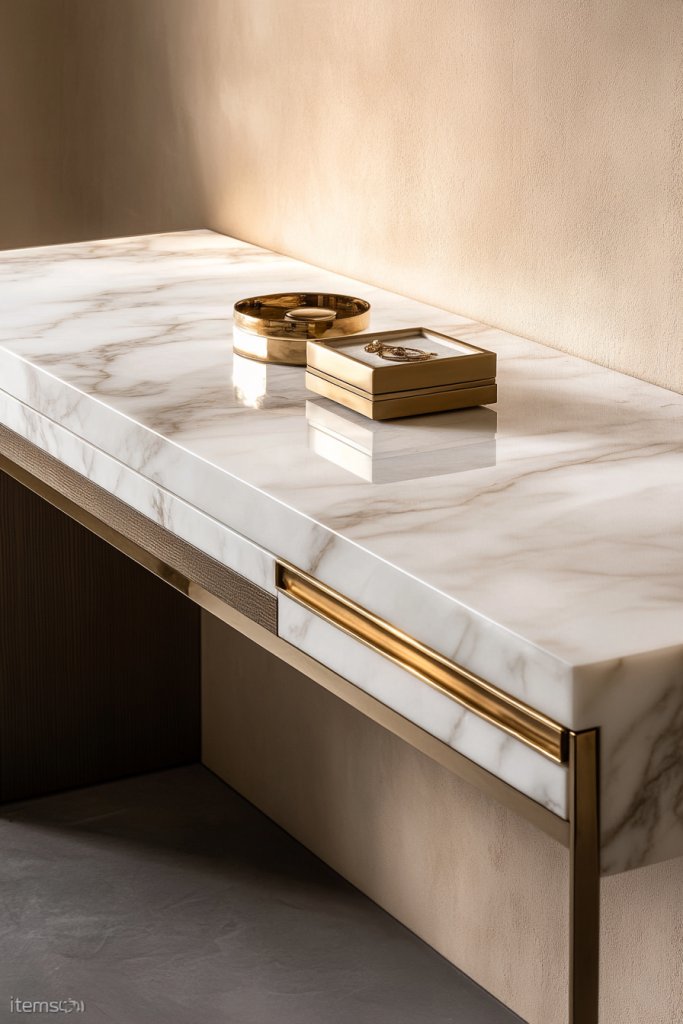 Imagine a smooth marble surface in shades of white, gray, or soft veining, supported by sleek brass or gold-finished legs and hardware. The contrast between the cool marble and warm metal adds richness and depth. Pair with a plush stool in a neutral or jewel tone to complete the luxe look. The overall aesthetic is elegant, modern, and effortlessly high-end.