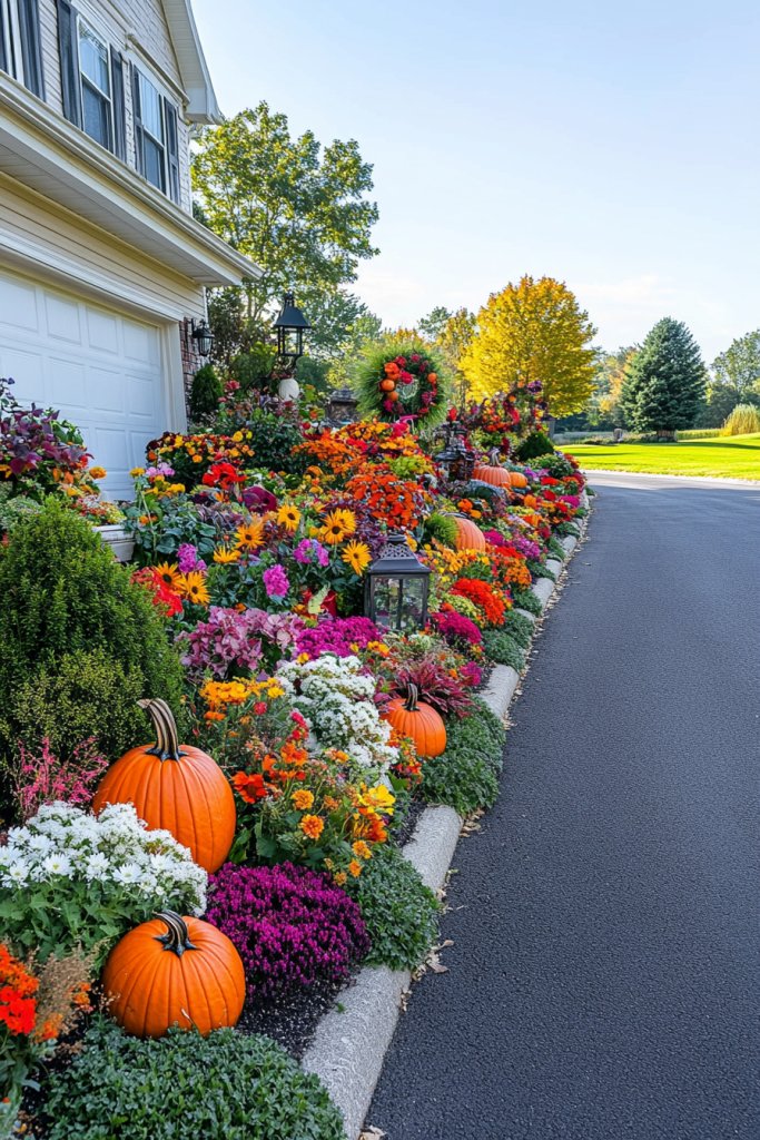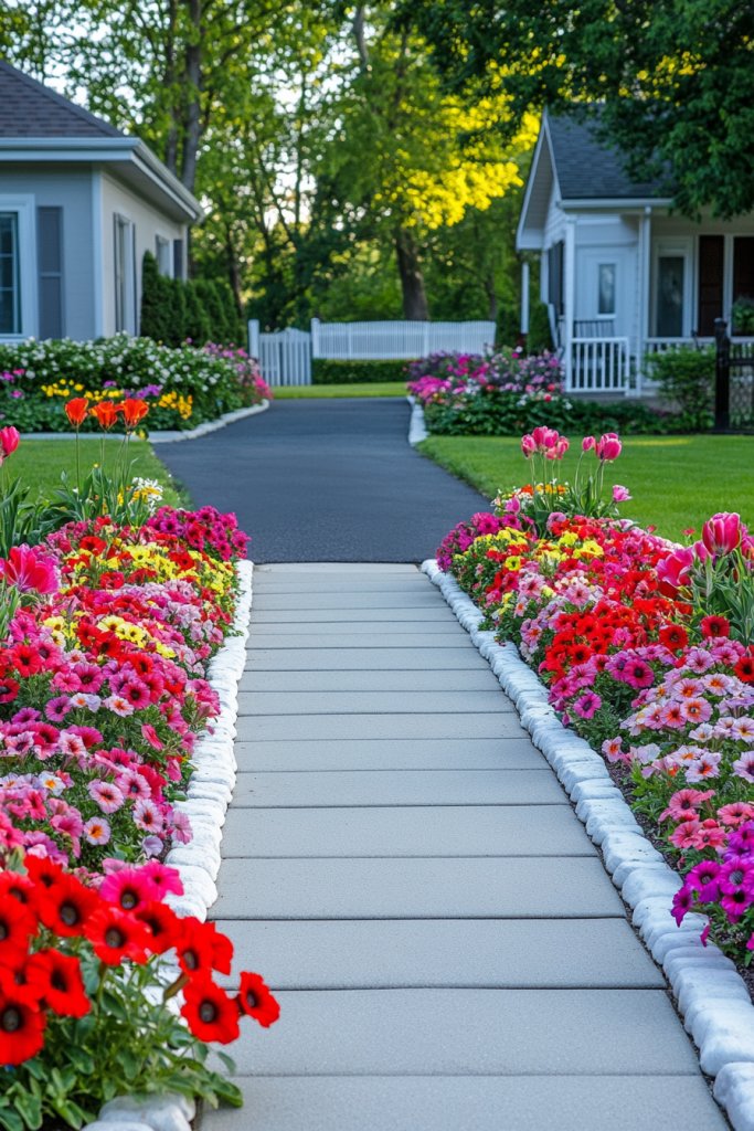 Imagine walking along a driveway flanked by low, neatly trimmed borders filled with vibrant perennials and seasonal blooms. The symmetry creates a mirror effect, with colorful flowers spilling over softly curved edges. The lush greenery contrasts with the stone or mulch base, adding texture. During sunset, the beds glow with warm light, inviting visitors in with a gentle, welcoming vibe. It’s a picture-perfect scene that’s both elegant and manageable.