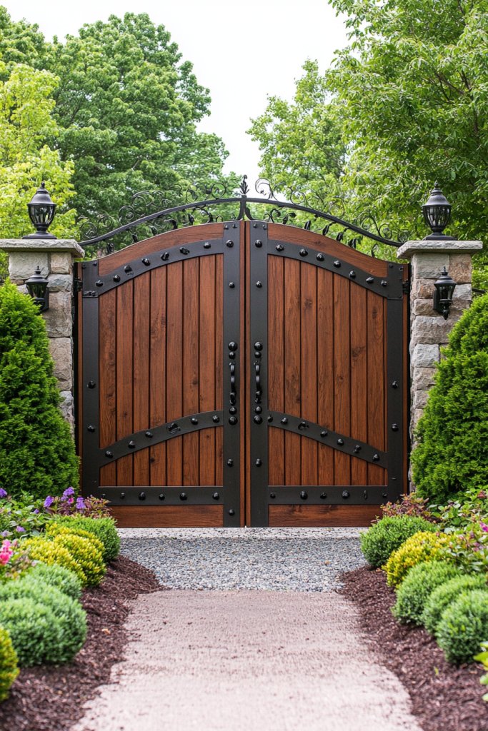 Imagine a sturdy wooden gate with intricate carvings or a sleek metal gate with modern geometric patterns. The gate is framed by lush planting beds or decorative fencing, guiding the eye inward. During the day, natural wood or metal contrasts beautifully with greenery, creating an inviting, balanced look. At night, subtle lighting highlights the gate’s design, making it a focal point. It’s a perfect blend of function and style.