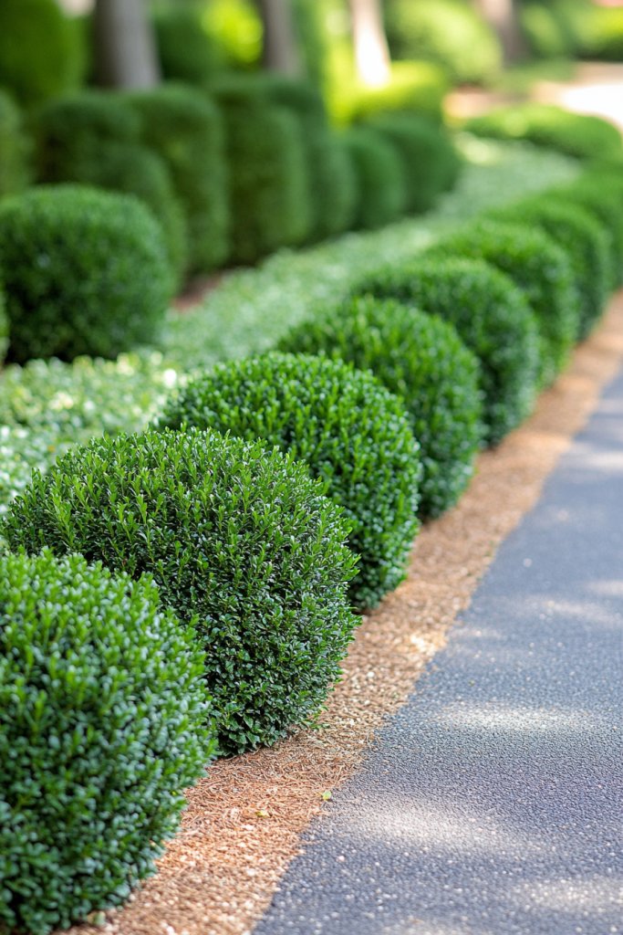 Select from varieties like boxwoods, yews, or junipers based on your climate and style preference. Use taller shrubs at driveway entrances for privacy and shorter ones along walkways for a softer look. Combine with flowering or ornamental grasses for texture variation. To keep a formal look, prune regularly into geometric shapes; for a relaxed style, let them grow naturally. Seasonal mulching or decorative stones can enhance their appearance.