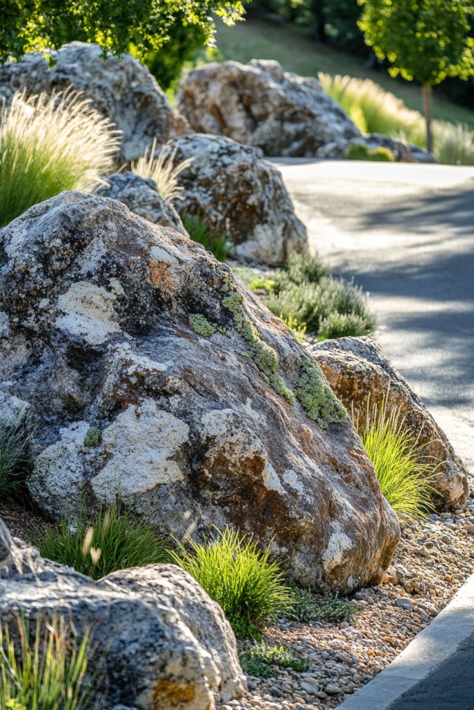 Choose rocks of different shapes and sizes depending on your landscape’s scale. For a modern look, select smooth, sculptural stones; for a rustic charm, opt for irregular, weathered boulders. Incorporate smaller stones or gravel around the base for a natural transition. Place them strategically along driveway curves or at entry points for maximum impact. Seasonal planting around the rocks can further personalize the scene.