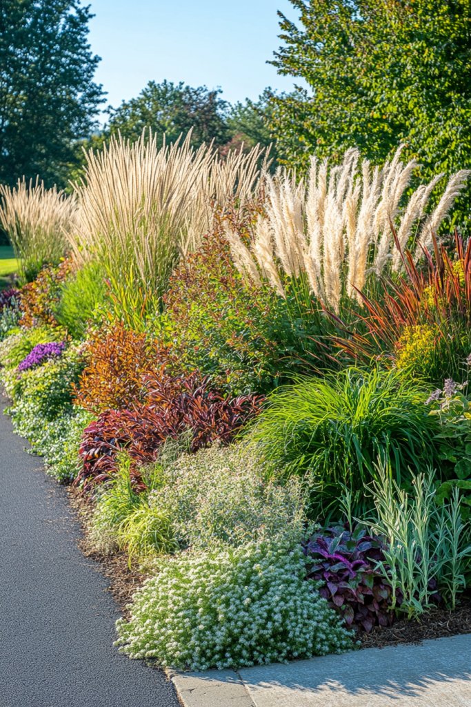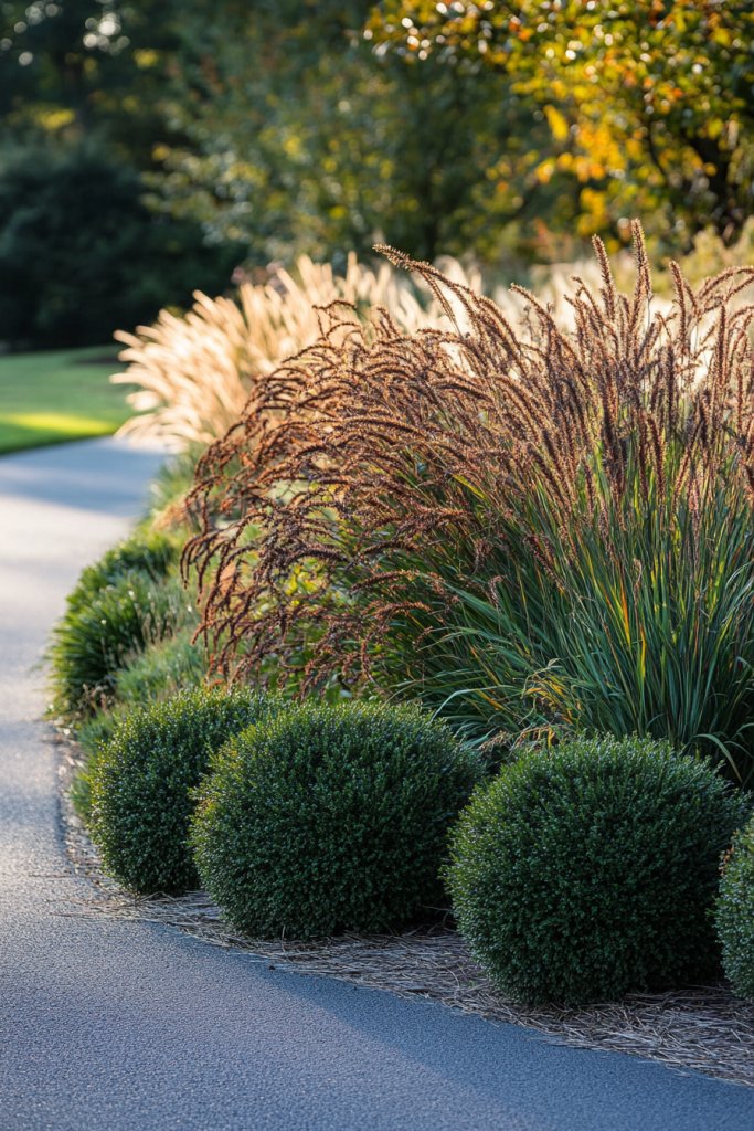Visualize a mix of tall ornamental grasses like fountain grass or miscanthus, paired with compact evergreen or flowering shrubs. The grasses sway gently in the breeze, adding a sense of motion, while the shrubs provide structure and color. During early mornings, dew on the grasses catches the light, creating a shimmering effect. The varied heights and textures guide the eye along your driveway, creating a natural, inviting rhythm. It’s a landscape that feels alive and dynamic.