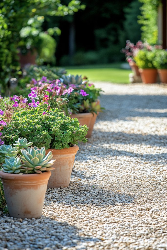 Picture a gravel pathway with colorful pots scattered along the sides, filled with lush herbs, trailing vines, or bright annuals. The uneven texture of gravel contrasts beautifully with the smooth ceramic or terracotta pots. As you walk in, the scent of herbs or blooming flowers greets you, creating a sensory-rich experience. The pots vary in height, adding depth and interest while the gravel provides a natural, textured surface. It’s an inviting, relaxed scene perfect for casual gatherings.