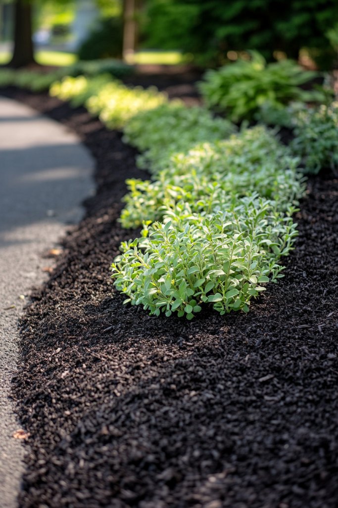 Picture a border of rich, dark bark mulch with creeping ground covers spilling over the edges—like creeping thyme or sedum. The soft, uniform layer creates a clean, finished look that contrasts nicely with the driveway surface. During the spring and summer, ground covers bloom or flower, adding vibrant pops of color and life. The textured mulch absorbs sunlight, giving the scene a warm, inviting glow. It’s a natural, understated beauty that’s both functional and stylish.