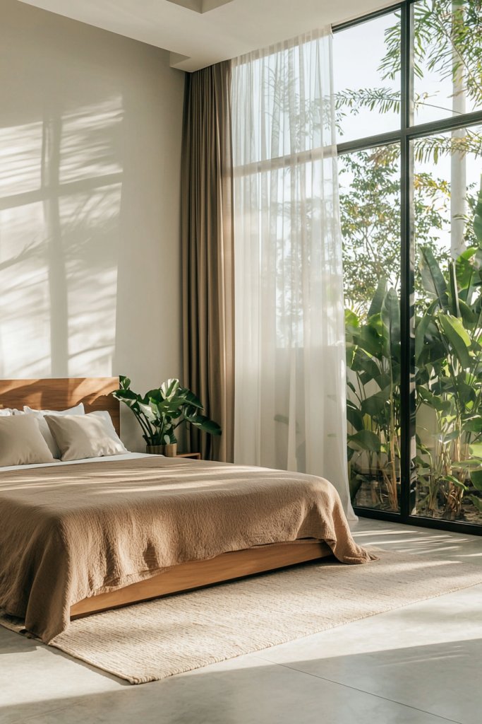 These materials gently diffuse sunlight, creating a dreamy, ethereal glow that enhances the tranquil atmosphere. You can also opt for sheer curtains to maintain privacy without sacrificing brightness.