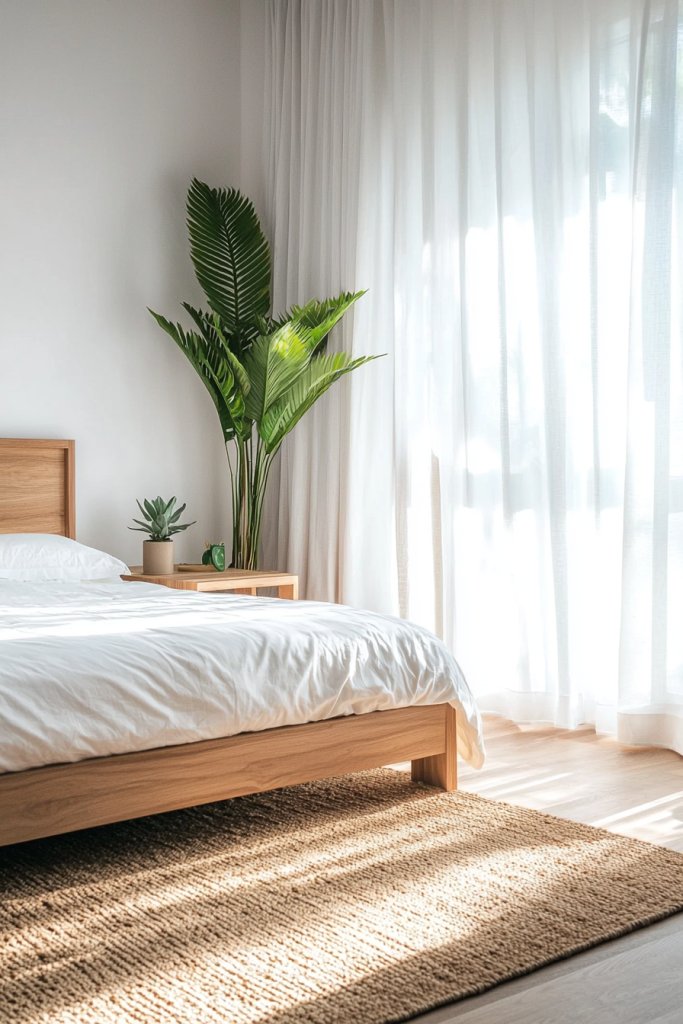 Incorporate plants, like a snake plant or peace lily, to bring life and fresh air into your sanctuary. You can also use natural fibers in your textiles, like a jute rug or linen bedding, which add texture and comfort.