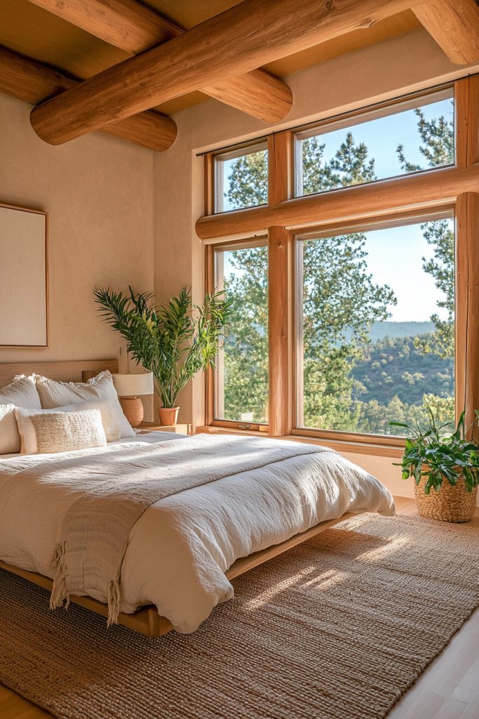 Not only do large windows create an airy atmosphere, but they also connect you to the outdoors, bringing in the beauty of nature. When you incorporate expansive glass panes, you invite warmth and serenity, making your bedroom feel more inviting.