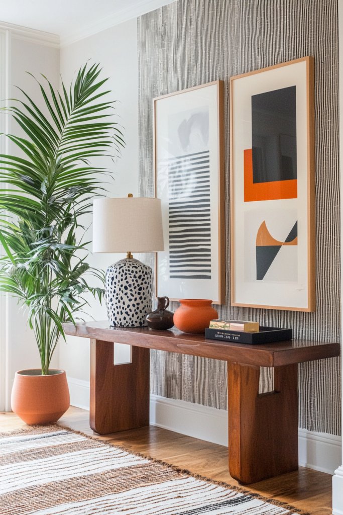 Finally, consider lighting; a distinctive pendant or a cluster of pendant lights can create a warm, welcoming glow. By thoughtfully curating these elements, your entryway will not just be functional, but a vibrant introduction to the rest of your eclectic abode.