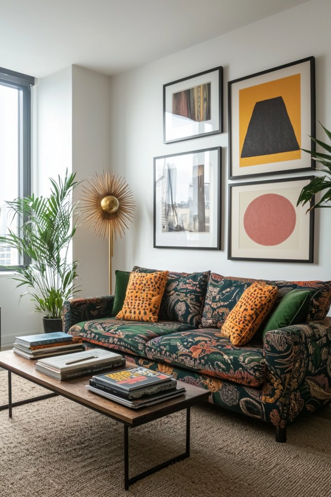 A bold, mismatched gallery wall featuring vintage prints can create an eye-catching focal point. You might also consider using vintage textiles, like a patchwork throw or embroidered cushions, to soften the overall look.