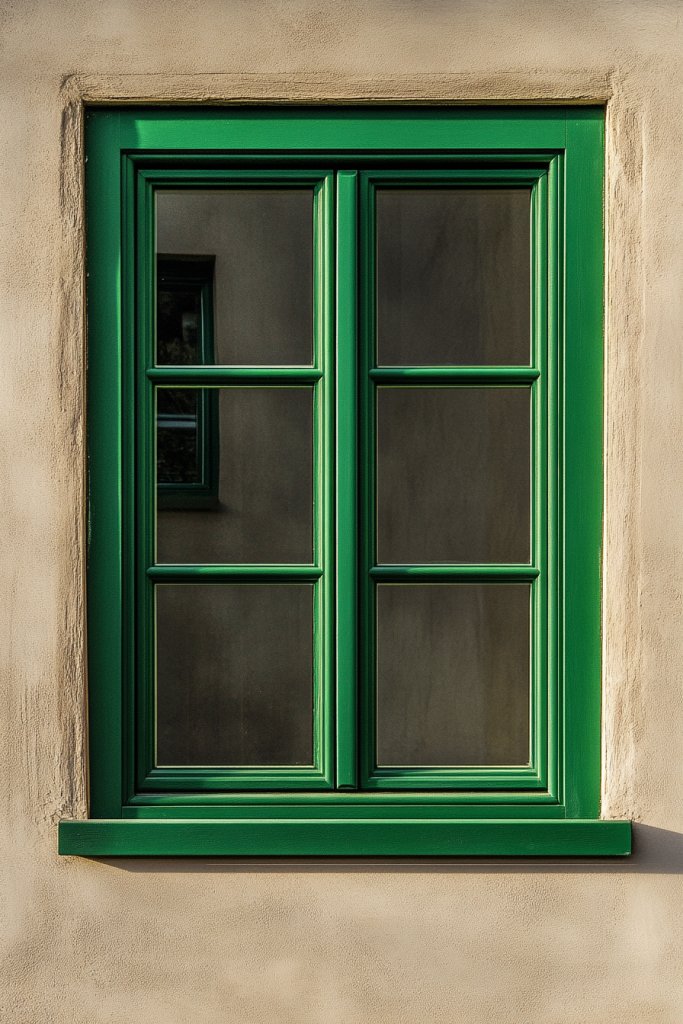 Imagine crisp, emerald window frames contrasting against neutral or light-colored walls. The vibrant hue frames the view, drawing attention to the outdoors while adding a sophisticated touch inside. Natural light filters through, highlighting the rich color and creating lively shadows. This detail elevates your entire facade and interior aesthetic.