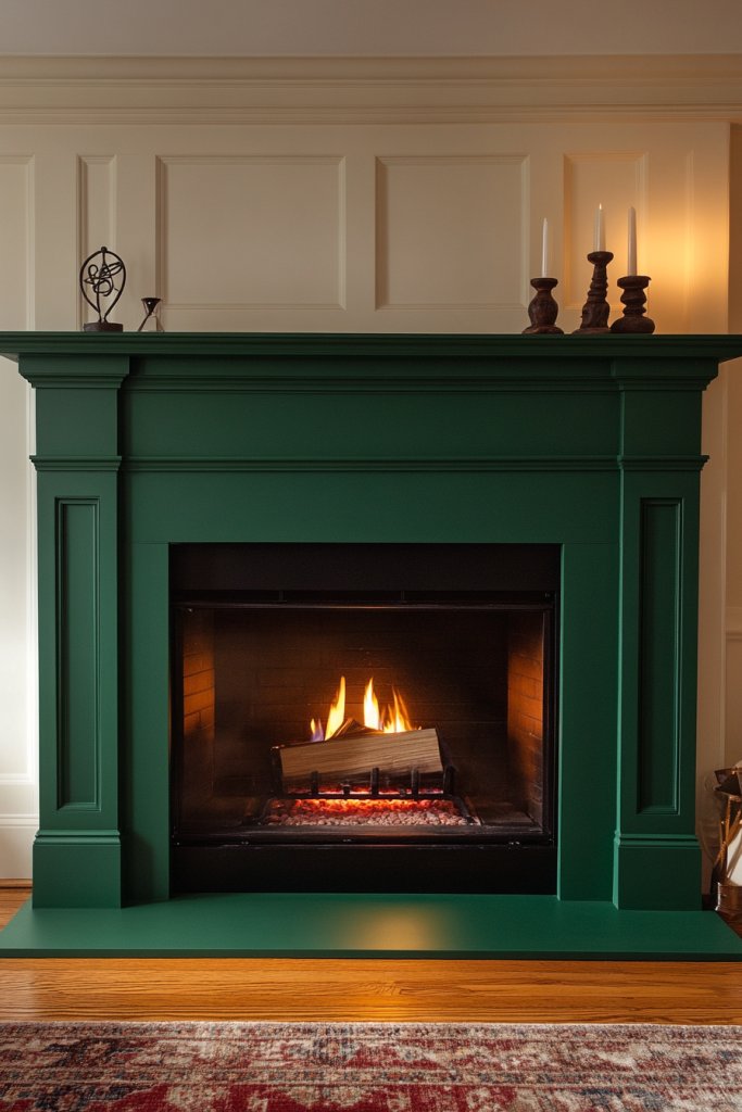 Picture a fireplace framed in shimmering emerald, with a textured or matte finish that contrasts beautifully with neutral walls. When lit, the fire’s glow reflects off the green surface, amplifying the cozy vibe. Decorate the mantel with candles, logs, or seasonal accents to enhance the ambiance. It becomes the heart of your home.