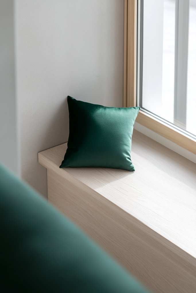 Imagine a room with white walls, light wood furniture, and a few carefully chosen emerald green decorative elements—like cushions, throws, or small accessories. Soft, natural light floods the space, making the green subtle yet impactful. The overall effect is calm, inviting, and effortlessly stylish, with just a hint of color to keep things interesting.