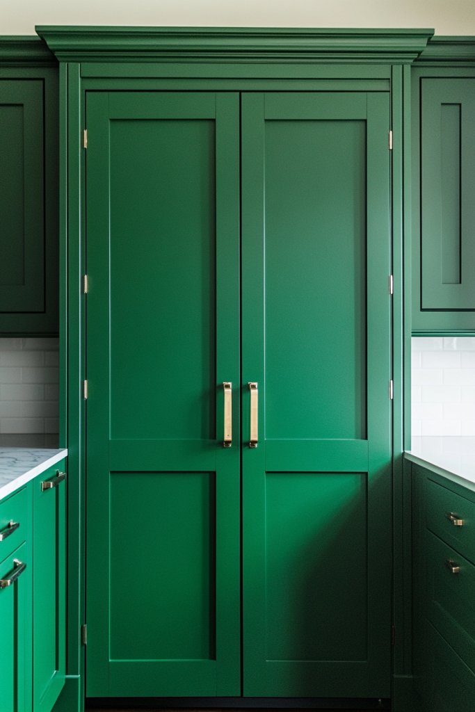 Imagine a row of pantry doors painted in rich emerald, contrasting against white or neutral cabinetry. The glossy or matte finish catches the light, making the doors stand out as a design element. When you open them, glimpses of bright, organized shelves greet you, sparking joy and inspiration. It’s a pop of color that’s both practical and playful.