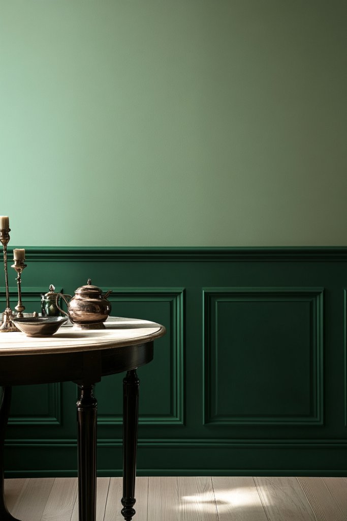 Visualize white or neutral walls with emerald wainscoting running along the lower third. The vibrant green adds depth and a regal feel, especially when paired with ornate moldings or decorative trim. Natural light highlights the glossy or matte finish, creating a cozy yet stately atmosphere. It’s perfect for dining rooms, hallways, or entryways.