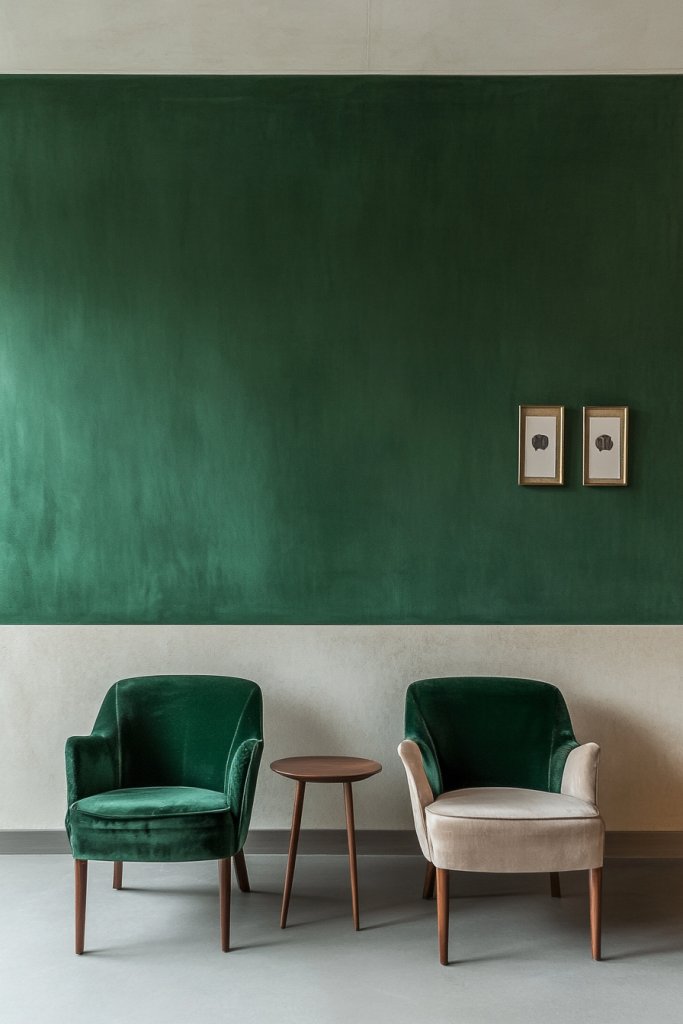 Picture a room where one wall is painted in a deep emerald hue while the adjoining wall remains a soft beige or warm taupe. The sharp contrast draws attention to architectural features like trims or wainscoting. When paired with natural light, the emerald pops vibrantly, while the neutral balances the overall aesthetic. This layered effect creates visual richness and sophistication, making the space feel thoughtfully designed.