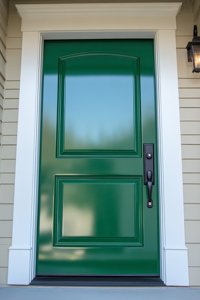 Imagine a shiny, reflective emerald door framed by crisp white trim and complemented by sleek hardware. The glossy finish catches sunlight, creating a stunning focal point that draws eyes from the street. Pair it with a modern door knocker or a unique house number for extra personality. The effect is bold, welcoming, and undeniably stylish.