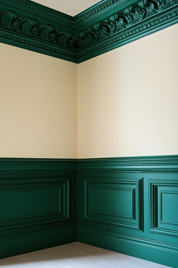 Picture crown molding and baseboards painted in a rich emerald hue, framing crisp white walls. The contrast draws attention to architectural details, making them stand out without overwhelming the space. Natural light highlights the glossy finish, adding a subtle sheen that enhances the room’s elegance. It’s a look that feels both refined and modern.