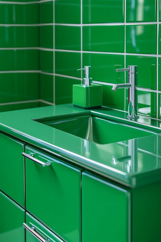 Visualize a sleek vanity in glossy emerald with modern hardware, set against crisp white tiles. The vibrant color adds energy and freshness, making the room feel more open and inviting. Complement it with a marble or quartz countertop and minimalist fixtures. The overall effect is clean, modern, and unexpectedly striking.