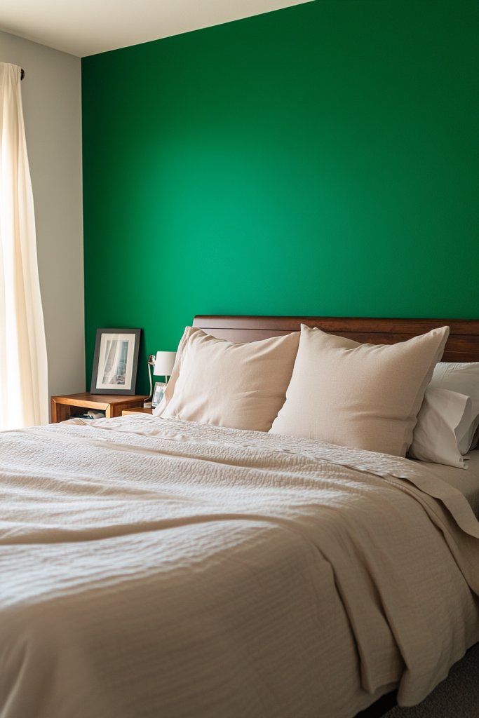 Picture a large wall behind your bed painted in deep emerald, contrasting with soft, neutral bedding and textured throw pillows. The rich color enhances the sense of intimacy and comfort. Soft lighting, like bedside lamps with warm bulbs, complements the hue, creating a calming glow. It’s an instant upgrade to your sleep sanctuary.