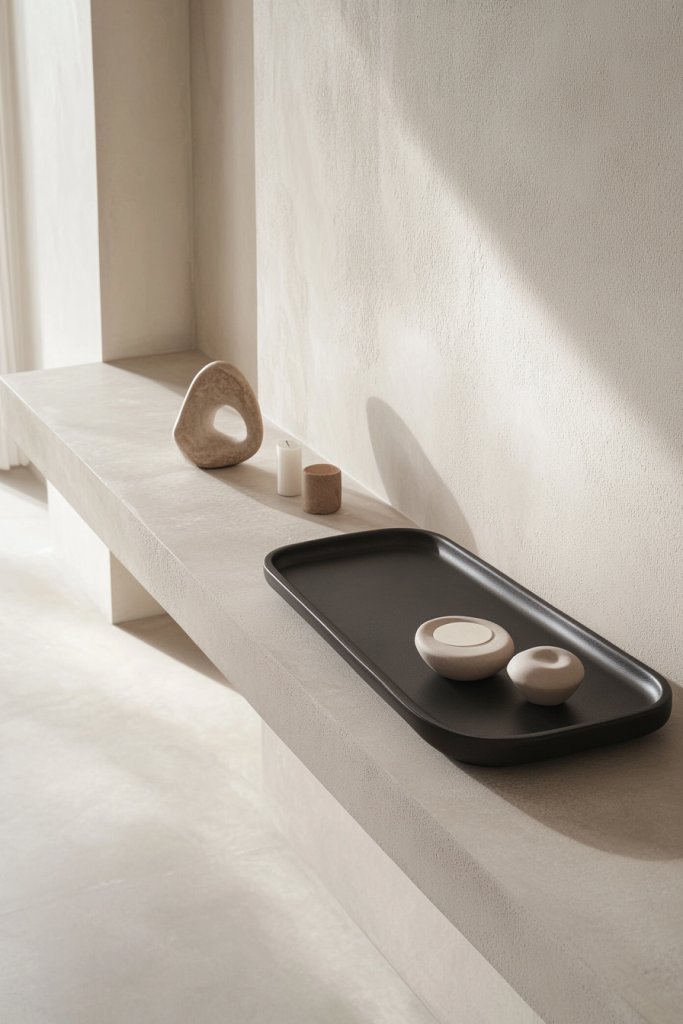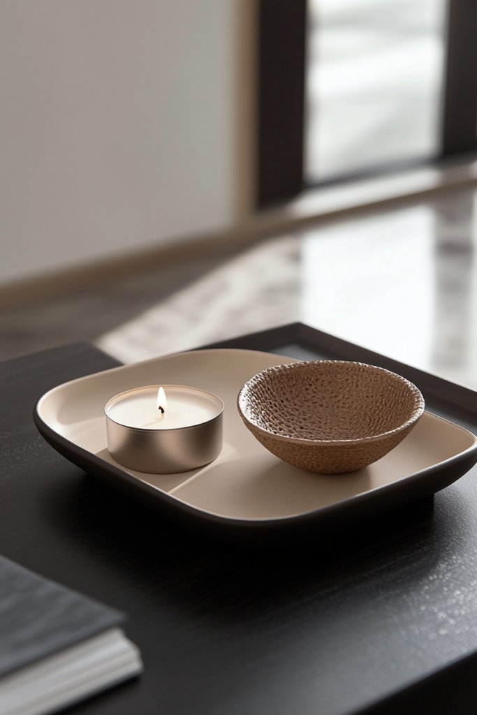 Imagine a slim, matte black tray resting on your console, filled with a few essential items like your keys, a pair of sunglasses, and a tiny decorative sculpture. The tray’s edges frame everything neatly, creating a visual anchor. Soft lighting highlights the textures—perhaps a smooth ceramic dish paired with a textured woven cloth beneath. It’s simple but visually pleasing, turning everyday essentials into curated decor.