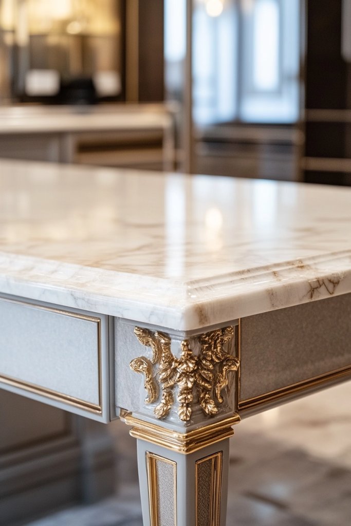 Select a marble or stone surface that fits your space and style—consider size, shape, and finish. Add metallic decor objects like a tray, sculptures, or hooks to match your hardware. Keep surfaces clean and polished to maintain the luxurious appearance. Use soft, warm lighting to accentuate the natural veining and metallic details. Regular dusting and careful cleaning preserve the surface’s beauty and integrity. Consider custom furniture for a seamless, high-end look.