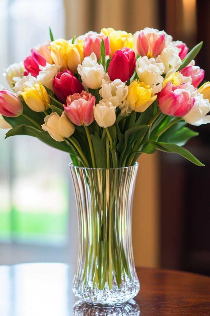 Picture a sleek, tall vase with a cluster of seasonal blooms—think peonies in spring or dahlias in summer—arranged artfully with lush greenery or textured branches. The colors burst with life against a neutral backdrop, catching the eye immediately. The soft fragrance of fresh flowers fills the air, adding an inviting atmosphere. The arrangement’s height and shape create a visual focal point, drawing guests in.