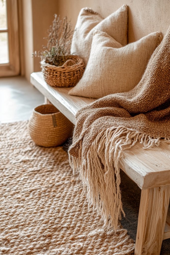 Visualize a textured woven rug, layered with a soft, fringed throw draped over a bench or console. Textured cushions, macramé wall hangings, and earthy-colored baskets add depth and warmth. Natural hues like terracotta, sandy beiges, and muted greens ground the space, making it feel organic and welcoming. Small decorative objects in woven or ceramic textures complement the overall boho aesthetic. The space feels relaxed, inviting, and full of character.