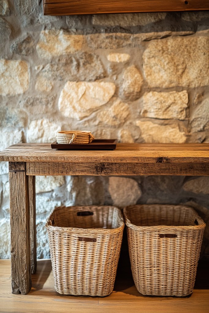 Select a sturdy wooden console that fits your space and style preference. Organize the baskets underneath for easy storage of everyday essentials. Decorate the top with a decorative tray, a small sculpture, or a candleholder that complements the rustic vibe. Use hooks or brackets to hang umbrellas or coats nearby. Regularly tidy and refresh the baskets to keep the entry feeling welcoming and organized. Consider DIY options for a personalized touch, like painting or distressing the wood.