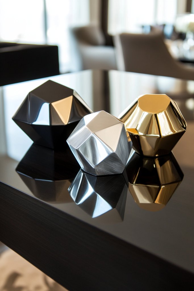 Mix different metallic finishes—brass, chrome, matte black—for layered interest. Incorporate textured textiles like a geometric patterned rug or pillows with metallic threads. Personalize with statement pieces that reflect your style, such as custom sculptures or uniquely shaped trays. Play with symmetry or asymmetry to suit your taste and space.