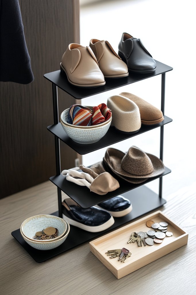 Visualize a slim, stylish stand with multiple tiers, holding shoes neatly aligned and accessories like hats or scarves in decorative bowls. The stand’s design can be sleek metal, painted wood, or a combination of both. Nearby, a small tray or dish keeps your keys, coins, or jewelry in one place. The aesthetic is clean and orderly, with a hint of personality from colorful accents or textured surfaces. The whole setup feels accessible yet thoughtfully curated.