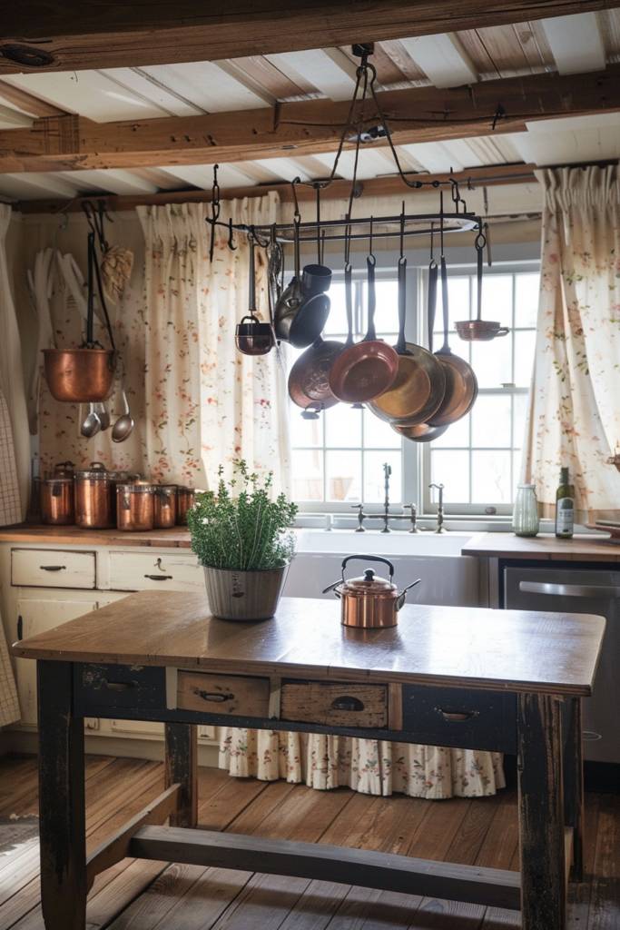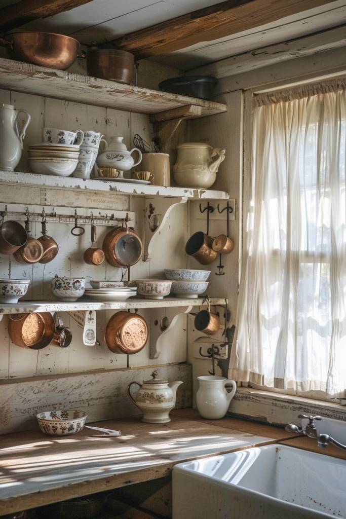 Consider incorporating a vintage farmhouse table as a centerpiece, adorned with an assortment of antique canisters or glass jars filled with dried herbs. Utilizing wall-mounted racks for hanging skillets or ladles can free up counter space while adding rustic flair. Don’t shy away from mixing in heirloom pieces that tell a story, like your grandmother’s baking tools or a set of colorful enamelware. By thoughtfully displaying antique kitchenware, you’ll create an inviting atmosphere that celebrates your love for both functionality and history in your farmhouse kitchen.
