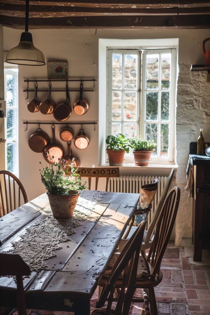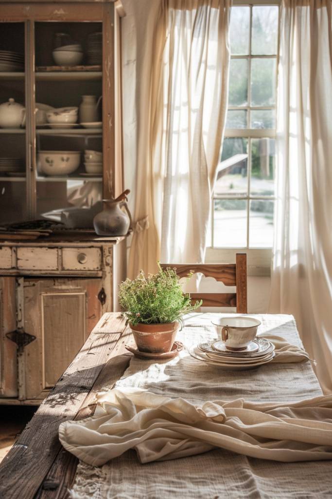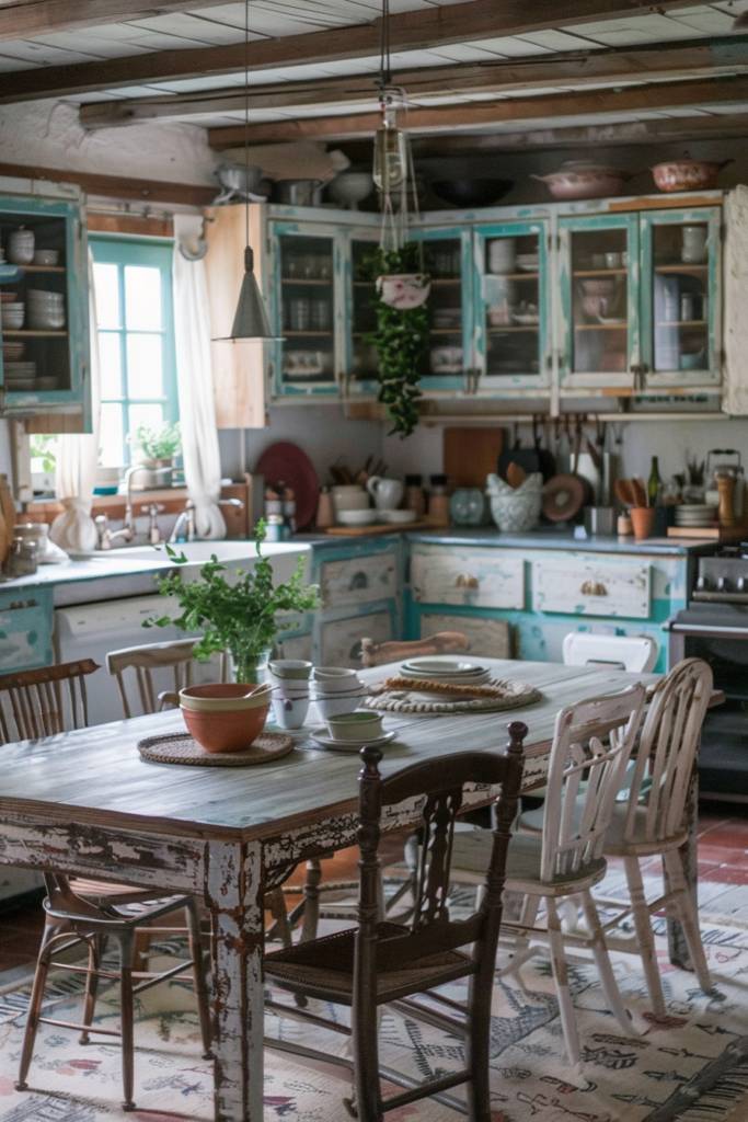 You might consider using distressed wood for your chairs or cabinets, creating a cohesive and inviting atmosphere. Shabby chic pieces, like a vintage sideboard with peeling paint, can serve as functional storage while enhancing the rustic vibe.