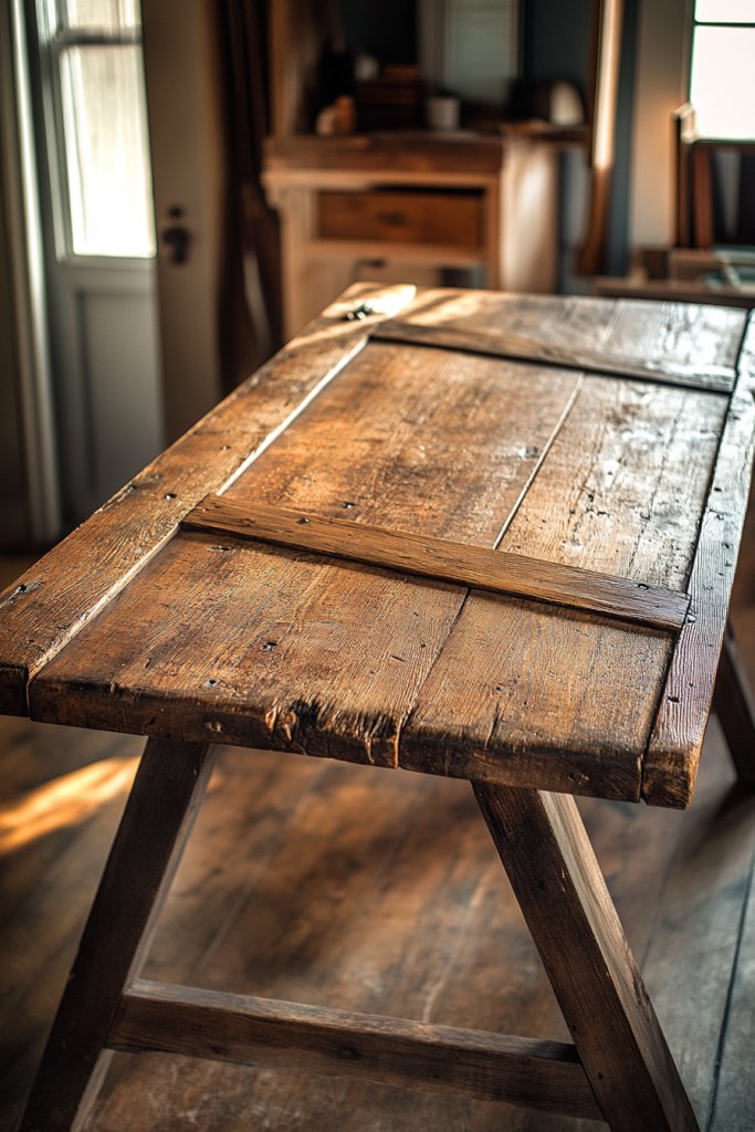 Imagine a large reclaimed door with peeling paint and weathered hardware serving as your workspace surface. Its wide span and solid build provide ample room for your laptop, notebooks, and decor. The rustic finish pairs beautifully with vintage accessories, baskets, and textured textiles. It’s a statement piece that commands attention and admiration.