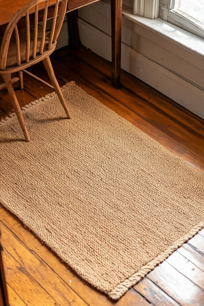 Visualize a woven jute or sisal rug under your desk, its coarse texture contrasting beautifully with weathered wood and soft textiles. The neutral tones blend seamlessly with other rustic elements, creating a layered, inviting environment. Small, decorative tassels or fringes add a finishing touch. The rug’s natural fibers add depth and warmth to the space.