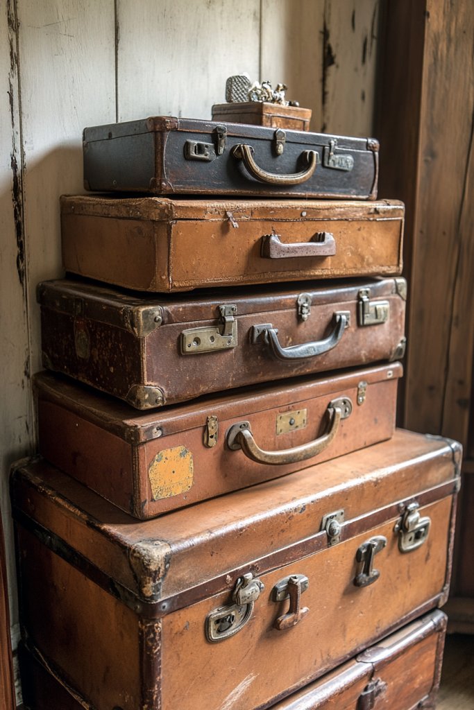 Visualize a stack of antique suitcases in muted tones—cream, battered leather, or faded patterns—serving as side tables or storage units. The weathered hardware and peeling paint add character and history. Inside, you stash files, craft supplies, or seasonal decorations. The suitcases form a charming focal point that’s both functional and decorative.