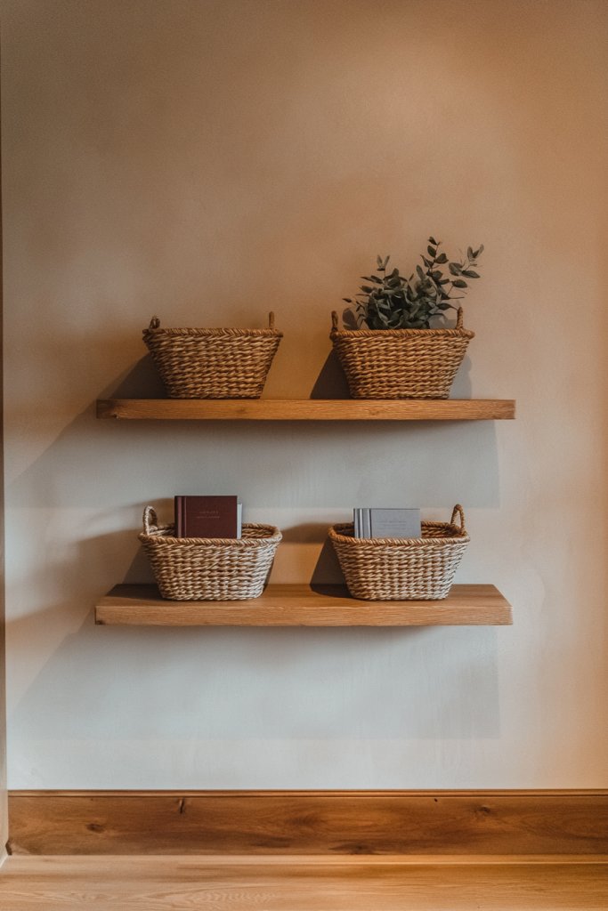 17. Minimalist Farmhouse Wall Shelves with Baskets