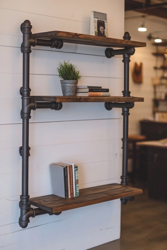 Visualize black iron pipes mounted on the wall with reclaimed wood planks resting atop them. The pipes’ matte finish contrasts nicely with the warm tones of wood, creating a bold statement. Decorate the shelves with vintage books, baskets, or decorative boxes, all arranged neatly. The open design keeps your workspace feeling airy and organized.