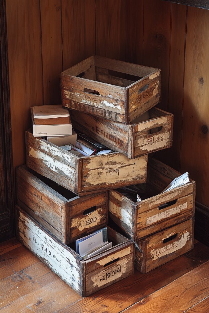 Imagine a set of weathered wooden crates stacked neatly on the floor or mounted on the wall with clear labels. The natural grain and imperfect finish give them authentic farmhouse character. Inside, you store files, supplies, or decorative items, keeping everything within arm’s reach. The arrangement creates a cozy, organized vibe.
